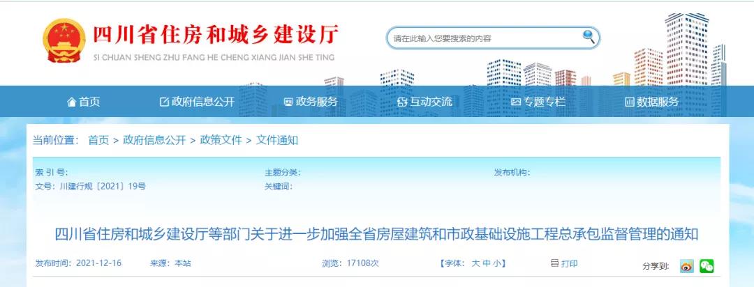 近日,四川省住建厅等部门发布关于进一步加强全省房屋建筑和市政基础设施工程总承包监督管理的通知。