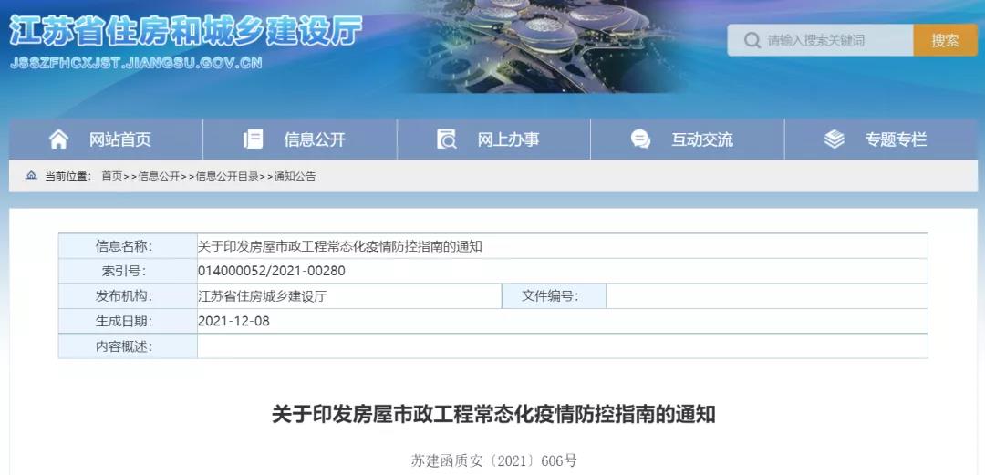 近日,江苏省住建厅官网发布了新版《关于印发房屋市政工程常态化疫情防控指南的通知》。