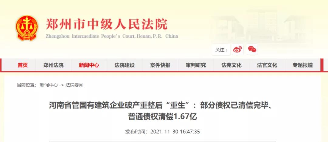 近日,郑州市中级人民法院召开新闻发布会,介绍了郑州两级法院办理破产重整案件的有关情况,并公布了典型案例:《河南省管国有建筑企业破产重整后"重生":部分债权已清偿完毕、普通债权清偿1.67亿》。