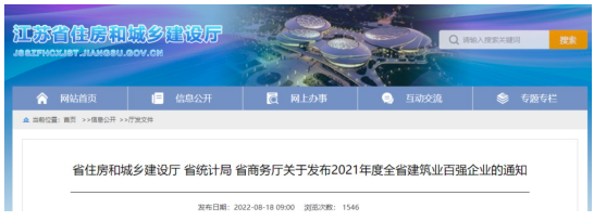 江苏省住建厅发布了《2021年度全省建筑业百强企业》最终名单。名单如下:
