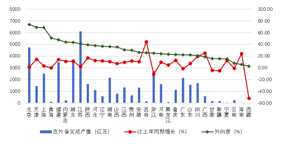 (二)各地区在外省完成的建筑业总产值情况 2022年上半年,各地区在外省完成的建筑业总产值排名前两位的仍然是江苏和北京,分别为6098.8亿元和4736.2亿元。两省在外省完成产值之和占全部在外省完成产值的比重为24.6%。湖北、福建、浙江、上海、湖南、广东、四川、陕西、河南、山东等10个地区,在外省完成的建筑业总产值均超过1500亿元。在外省完成的建筑业总产值同比增长最快的是吉林,达到了44.3%。广西、海南的增幅也超过了20%。7个地区在外省完成的建筑业总产值出现负增长,其中西藏的负增长超过50%,浙江的负增长超过10%。从外向度(即本地区在外省完成的产值占本地区建筑业总产值的比例)来看,排在前三位的地区是仍然北京、天津和上海,分别为 74.0%、69.1%和68.3%。外向度超过30%的还有青海、福建、内蒙古、湖北、江苏、陕西、河北、辽宁、湖南、山西、江西、贵州等12个地区。