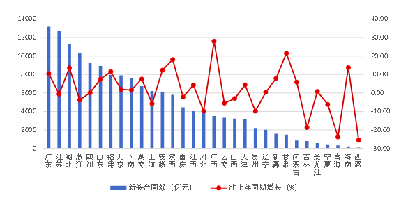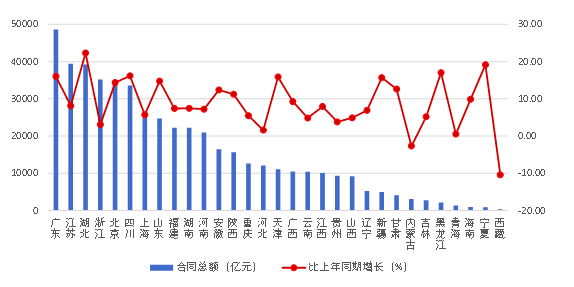 (四)建筑业企业签订合同总额、新签合同额情况 2022 年上半年,广东、江苏、湖北、浙江、北京、四川6个地区建筑业企业签订合同总额均超过30000亿元,分别达到48601.5亿元、39419.9亿元、39209.2亿元、35191.7亿元、35082.3亿元和33563.3亿元。合同总额超过20000 亿元的还有上海、山东、福建、湖南、河南等5个地区。合同总额同比增长最快的是湖北,达到了22.3%。宁夏、黑龙江、四川、广东、天津和新疆的增幅均超过了15%。西藏、内蒙古的合同总额出现负增长,其中西藏的负增长超过10%(图6)。