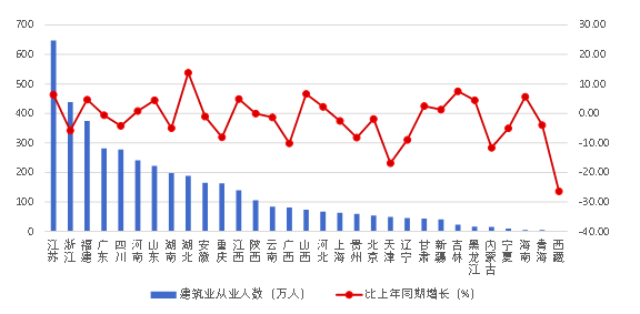 2022年上半年,全国建筑业从业人数超过百万的地区仍然是13个。江苏、浙江依然是从业人数大省,人数分别达到 647.1万人和 437.9万人。福建、广东、四川、河南和山东等5地区从业人数均超过200万人。与上年同期相比,13个地区的从业人数增加。其中,增加人数最多的是江苏,增加 38.6万人。18个地区的从业人数减少。其中,减少最多的是浙江,减少27.0万人。从业人数增幅最大的是湖北,增幅为13.8%;降幅最大的是西藏,下降了26.4%。
