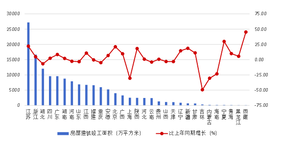 2022 年上半年,江苏、浙江、湖北建筑业企业房屋建筑竣工面积均超过1亿平方米,分别达到2.7亿平方米、1.7亿平方米、1.2亿平方米。房屋建筑竣工面积超过 5000万平方米的还有四川、广东、湖南、河南、山东、江西、福建、重庆、安徽等 9个地区。房屋建筑竣工面积同比增长最快的是西藏,达到了45.3%。宁夏、江苏、北京的增幅也都超过了20%。12个地区房屋建筑竣工面积出现负增长,其中吉林、上海、内蒙古的负增长均超过30%(图9)。