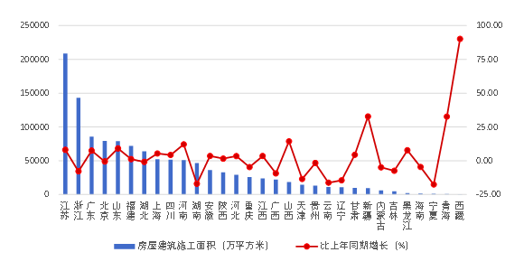 (五)房屋建筑施工面积、竣工面积情况 2022 年上半年,江苏、浙江建筑业企业房屋建筑施工面积均超过10亿平方米,分别达到20.9亿平方米、14.3亿平方米。房屋建筑施工面积超过 5亿平方米的还有广东、北京、山东、福建、湖北、上海、四川、河南等 8 个地区。房屋建筑施工面积同比增长最快的是西藏,为90.1%。新疆、青海增幅均超过30%。14个地区房屋建筑施工面积出现负增长,其中宁夏、湖南、云南的负增长均超过15%(图8)。