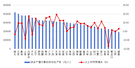 2022年上半年,26个地区的按建筑业总产值计算的劳动生产率保持增长。劳动生产率排序前三位的地区是湖北、北京和青海,分别为417901元/人、401117元/人和383289元/人。劳动生产率增幅超过 15% 的是天津、内蒙古、广东和贵州4个地区。5个地区按建筑业总产值计算的劳动生产率出现下降,吉林的降幅超过16%(图 5)。