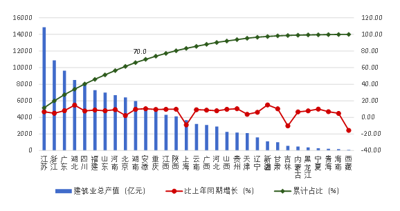 二、2022 年上半年各地区建筑业基本情况 (一)建筑业总产值完成情况 2022 年上半年,江苏、浙江继续领跑全国各地区建筑业,建筑业总产值双双超过1万亿元,分别达到 14872.0亿元和10866.6亿元,分别占全国建筑业总产值的11.5%和8.4%。除江苏、浙江外,总产值超过5000亿元的还有广东、湖北、四川、福建、山东、河南、北京、湖南、安徽等9个地区,上述11省市完成的建筑业总产值占全国建筑业总产值的 70.0%。从各地区建筑业总产值增长情况看,28个地区的建筑业总产值较上年同期都有不同幅度的增长。其中,新疆增幅最大,达到了 15.1%。湖北、贵州、安徽、甘肃、宁夏等6个地区的增幅均在10%以上。西藏、吉林、上海3个地区的建筑业总产值较上年同期出现负增长。
