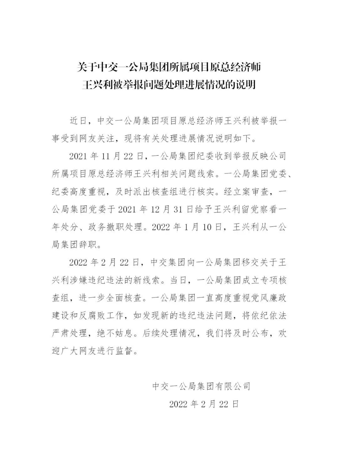 2月22日晚10时许,中交一公局集团有限公司官方微博发布声明称,2021年11月,该集团纪委已经立案审查,于2021年12月31日给予被举报人王兴利留党察看一年处分、政务撤职处理。