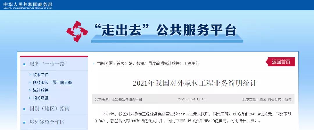 束珏婷说,2021年,中国对外投资合作平稳发展。全行业对外直接投资9366.9亿元人民币,同比增长2.2%。中国对外承包工程完成营业额9996.2亿元人民币,同比下降7.1%;新签合同额16676.8亿元人民币,同比下降5.4%。