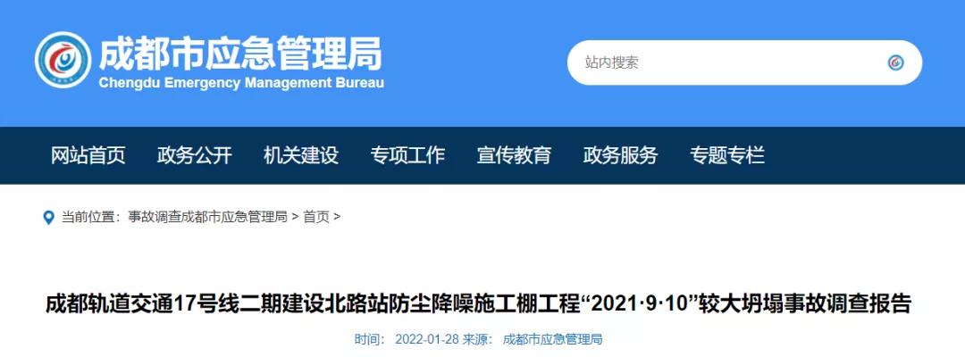 事故发生后,四川省安委会办公室对事故调查处理工作进行挂牌督办,成立了地铁17号线二期建设北路站防尘降噪施工棚工程"2021·9·10"较大坍塌事故调查组(下称:事故调查组),通过现场勘查、取样检测、调查取证、查阅资料、人员问询、专家论证等方式,查明了事故经过、发生原因、人员伤亡情况和直接经济损失,认定了事故性质及责任,提出了对有关责任单位、责任人员的处理建议及防范整改措施建议。